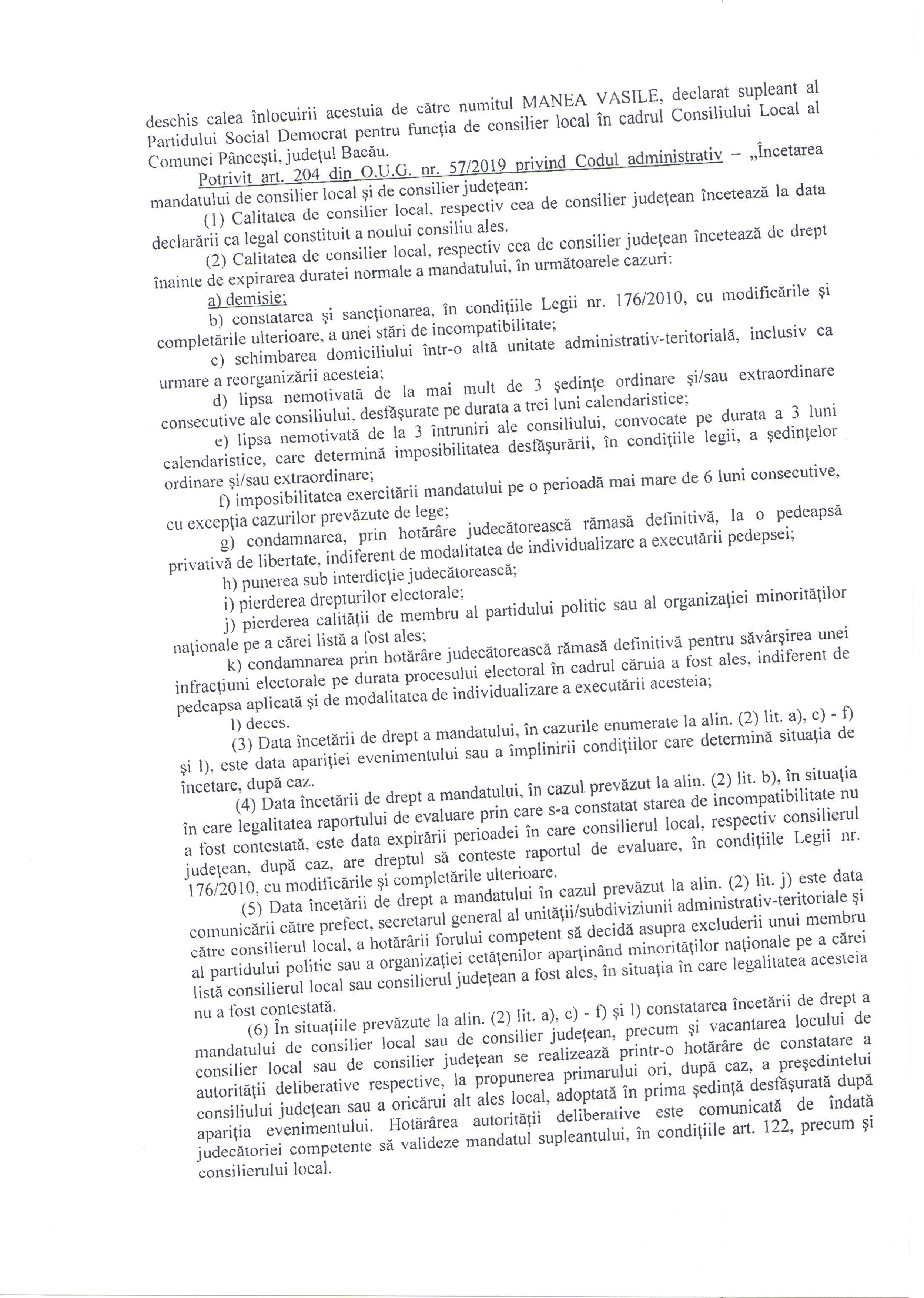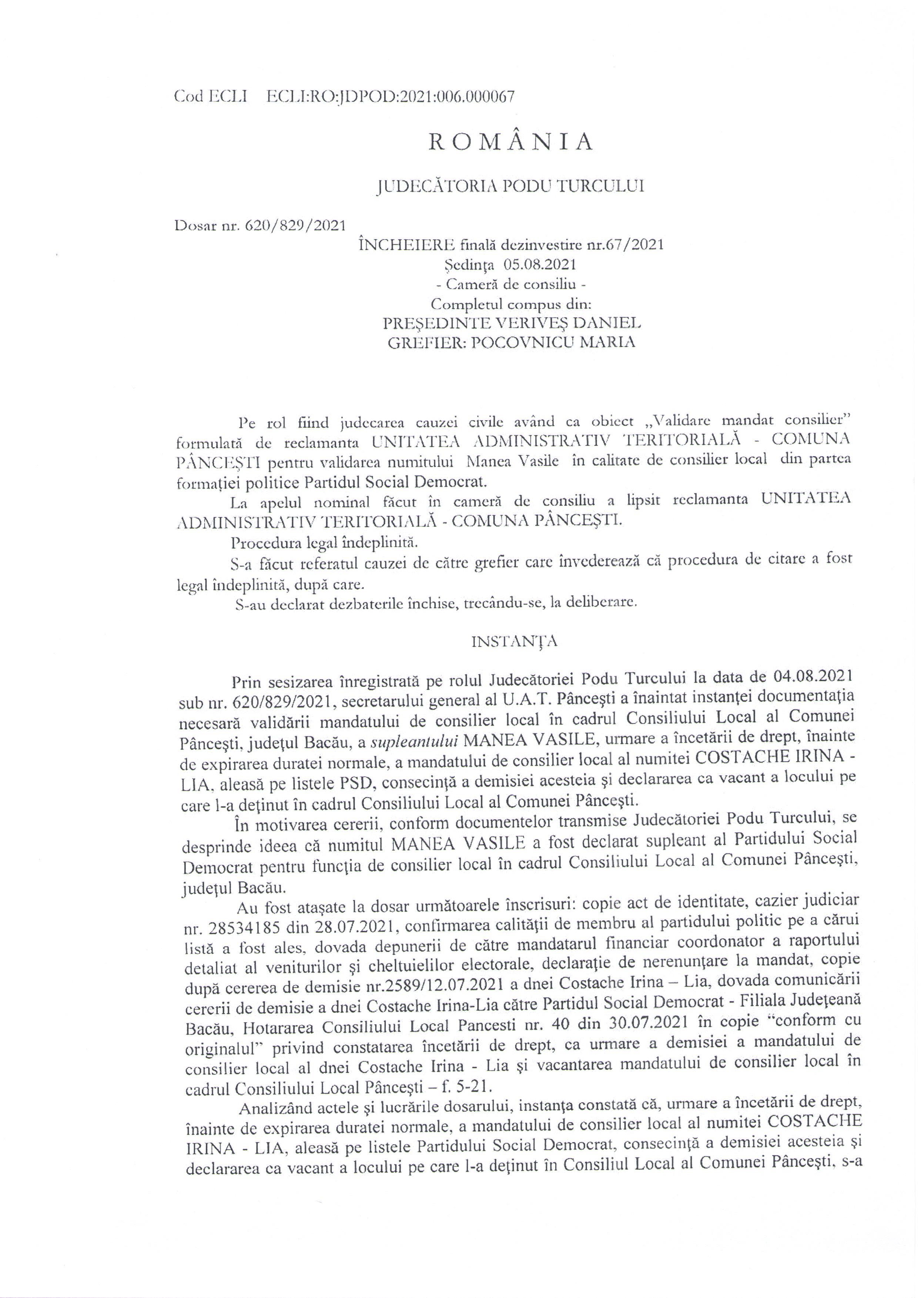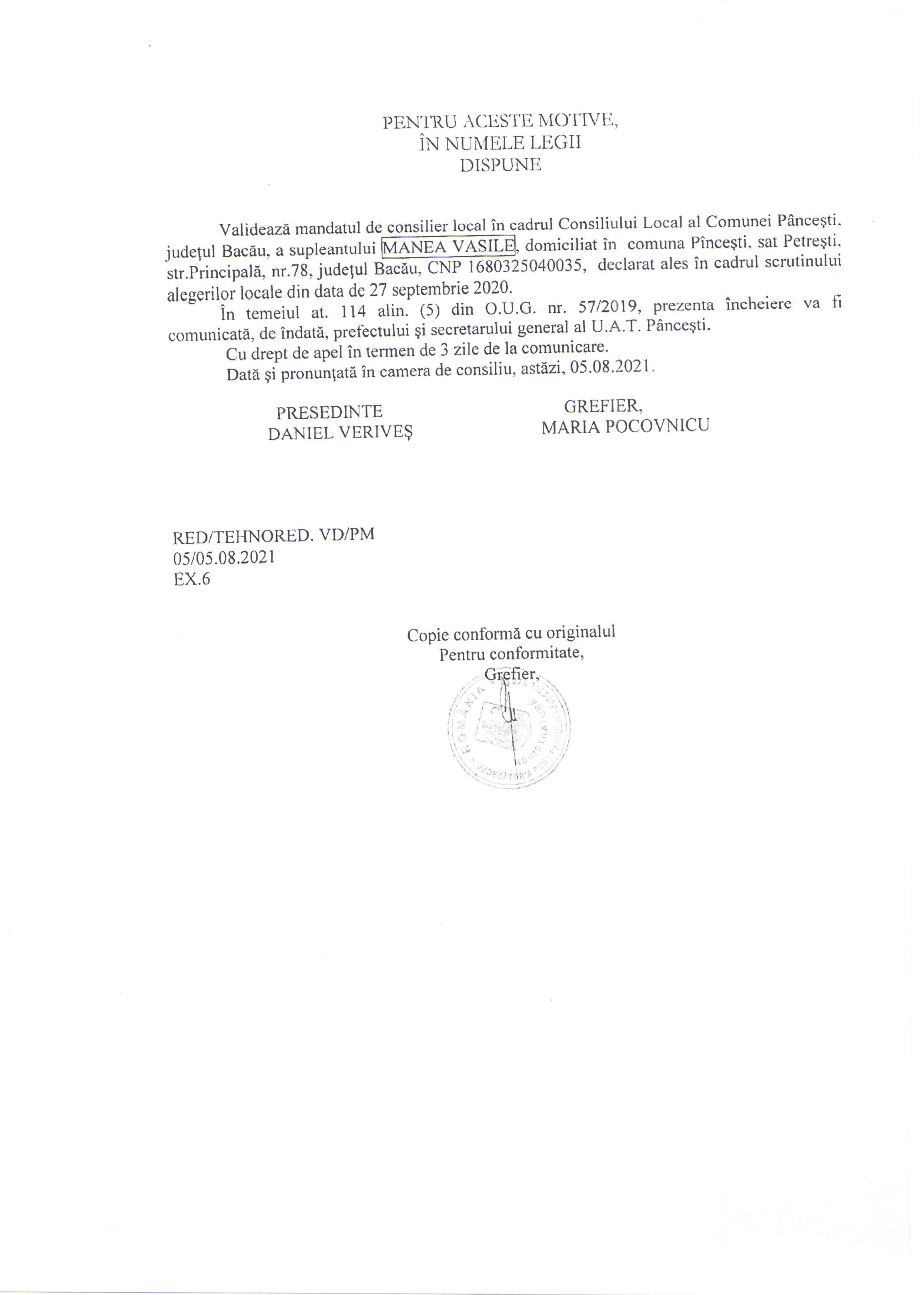 HOTARARE DE VALIDARE A MANDATULUI DE CONSILIER PENTRU MANEA VASILE