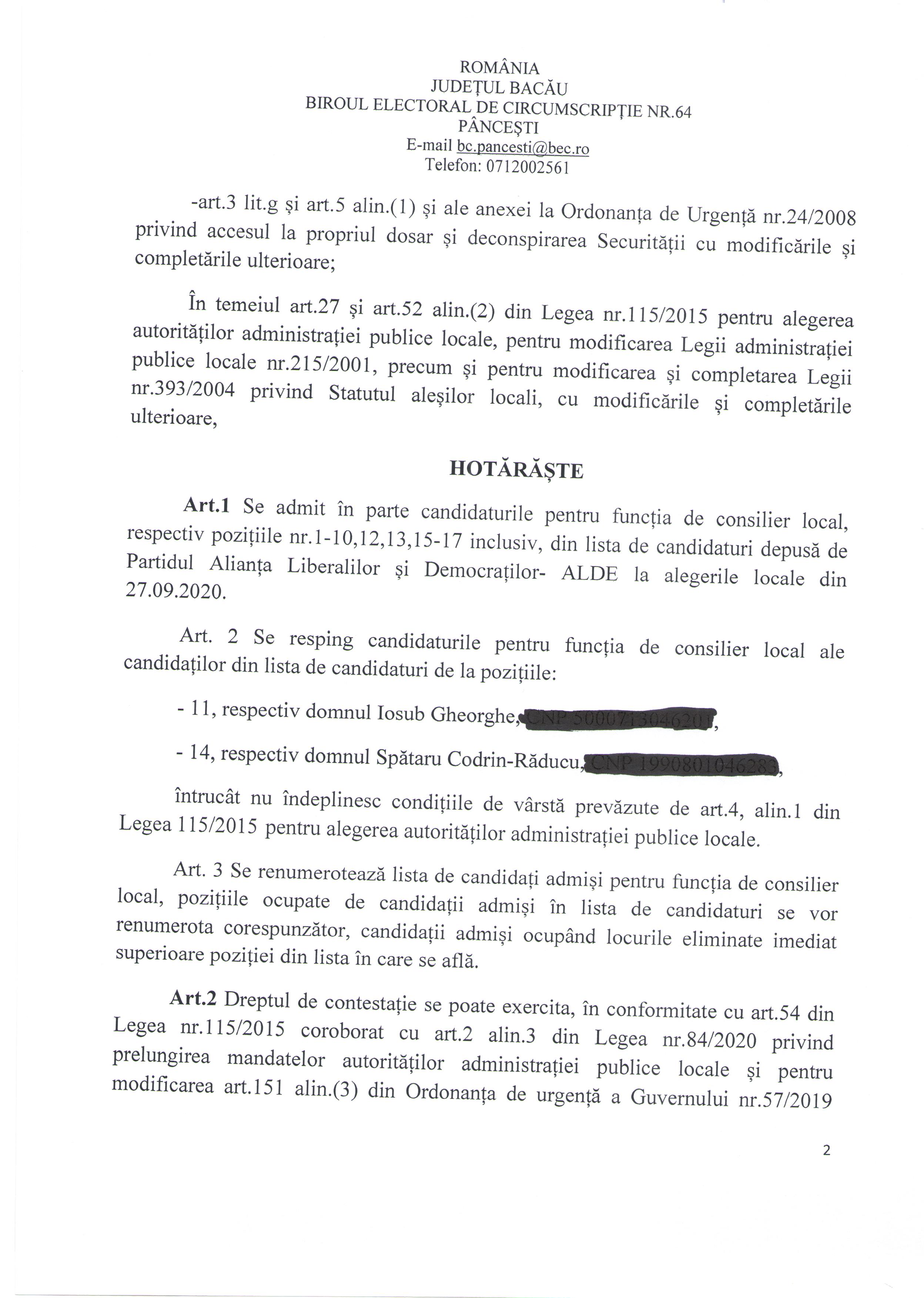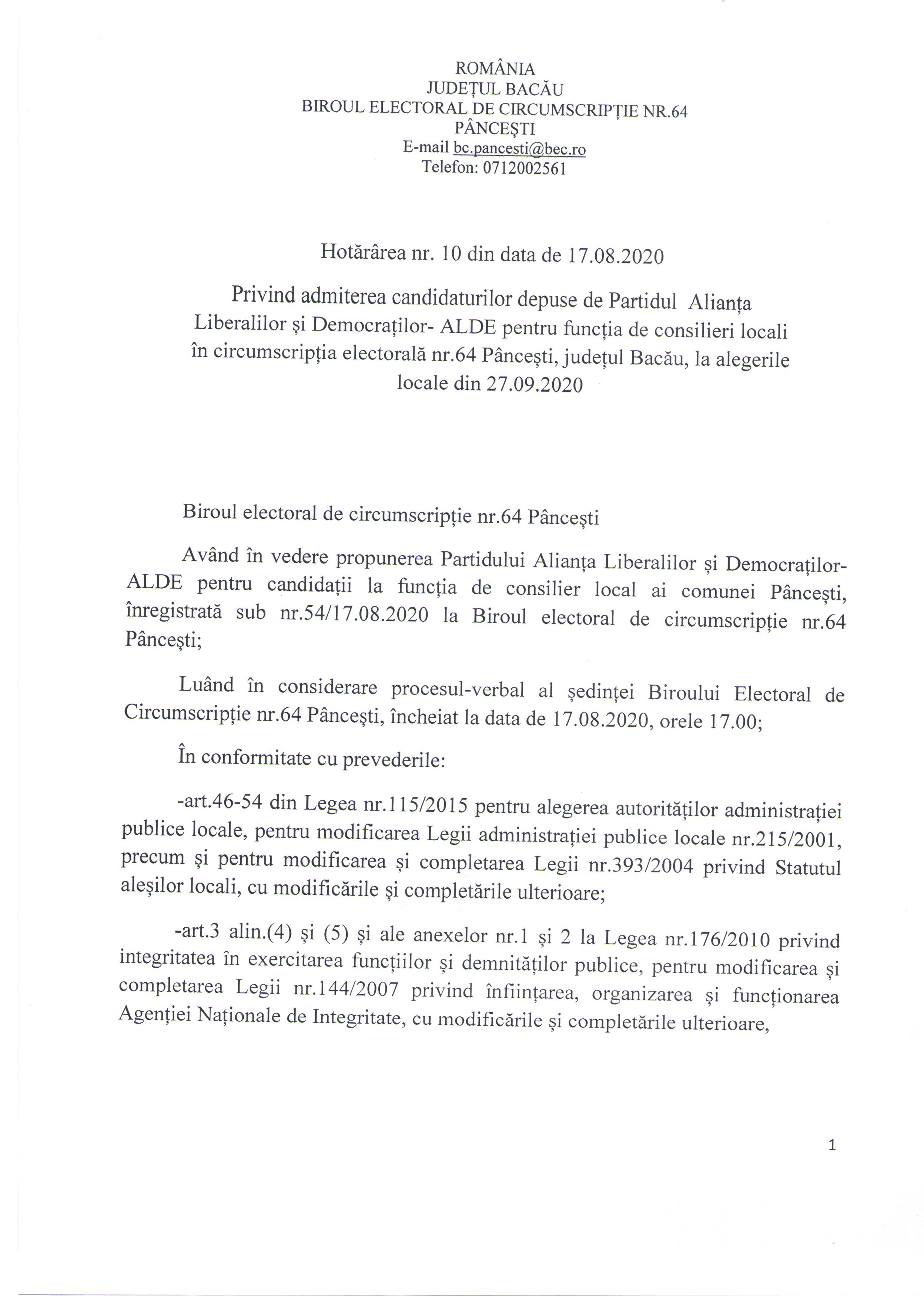 Privind admiterea candidaturilor depuse de ALDE pentru functia de consilieri locali ai comunei Pancesti
