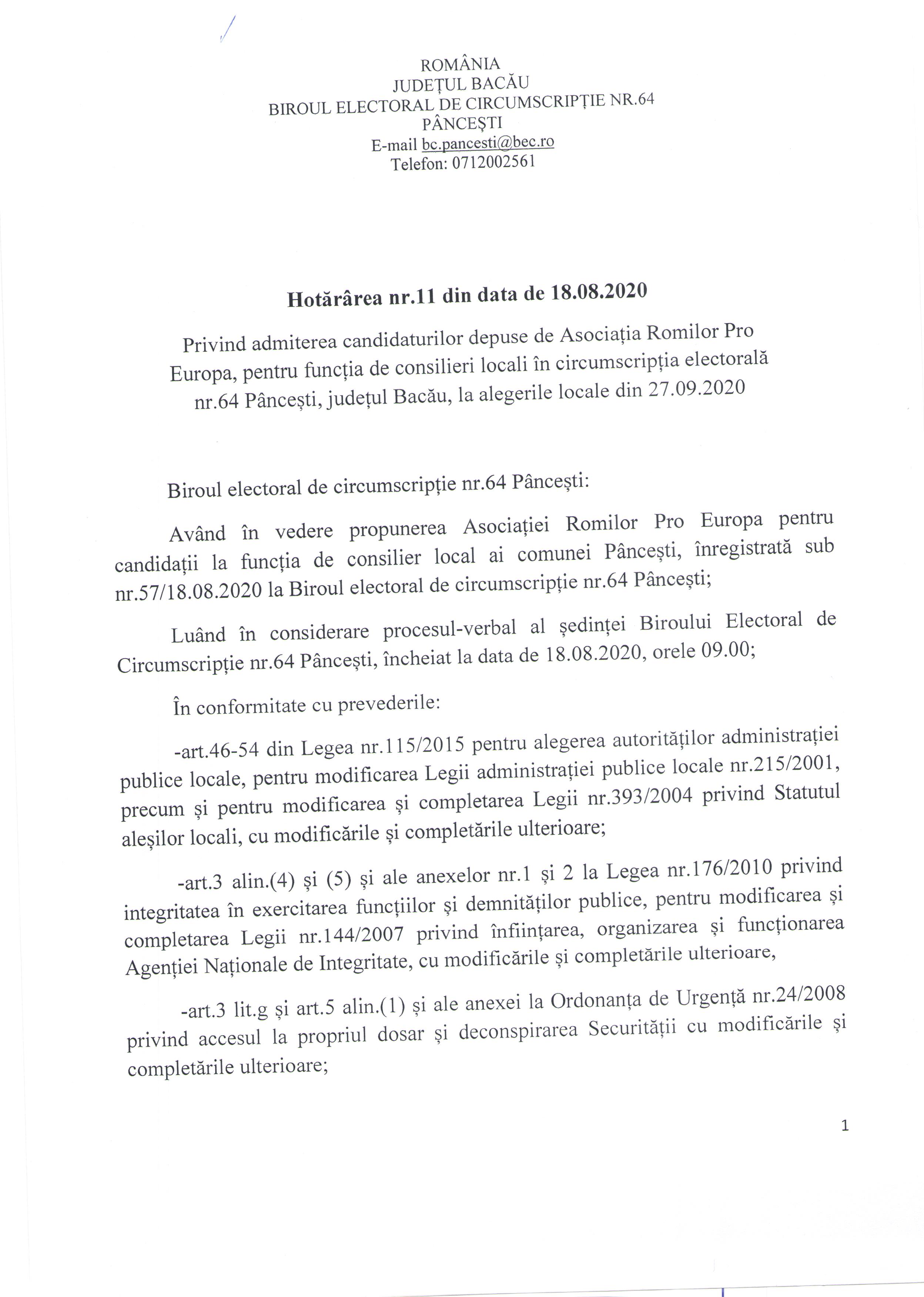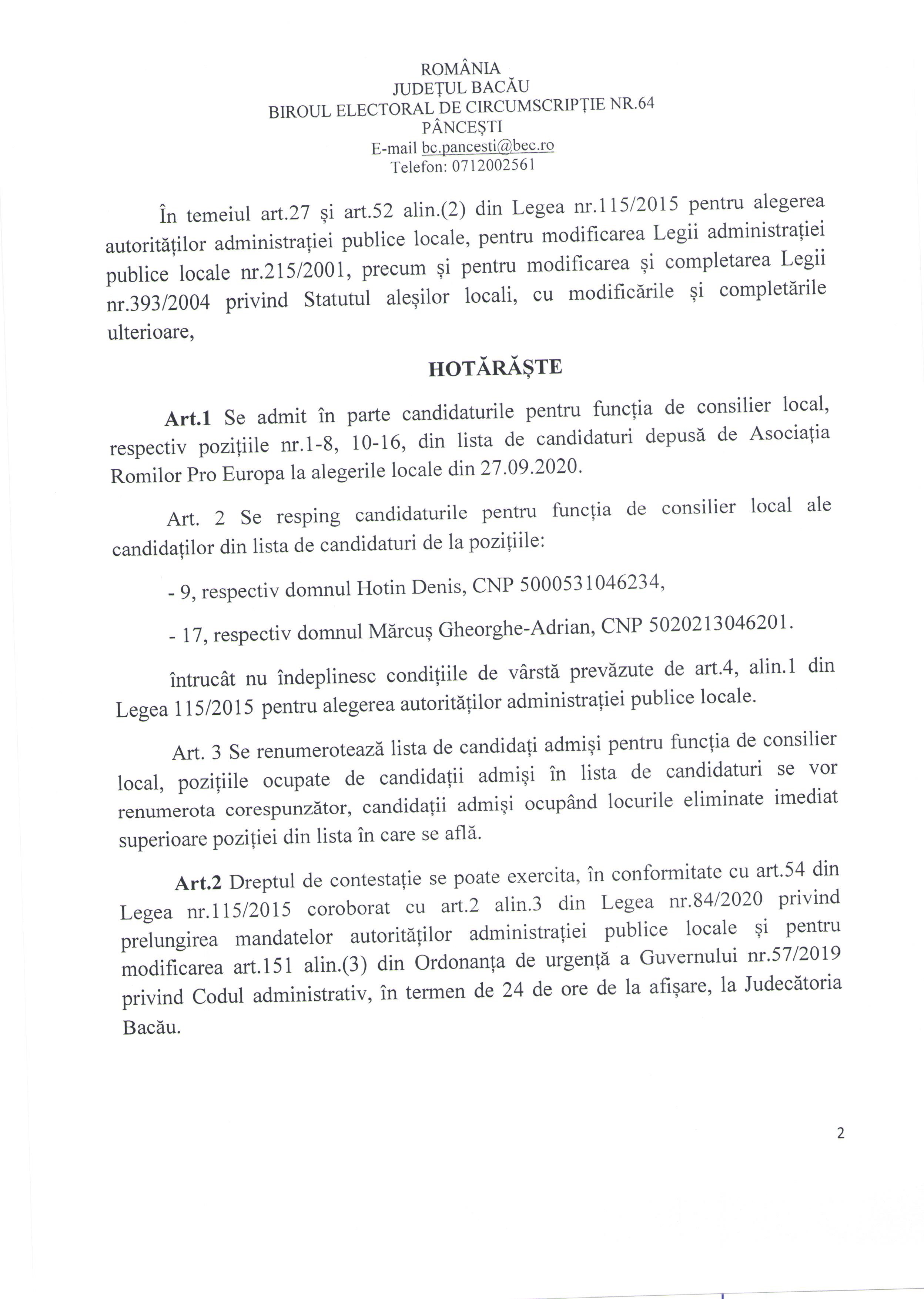 Privind admiterea candidaturilor depuse de Asociatia Romilor Pro Europa, pentru functia de consilieri locali