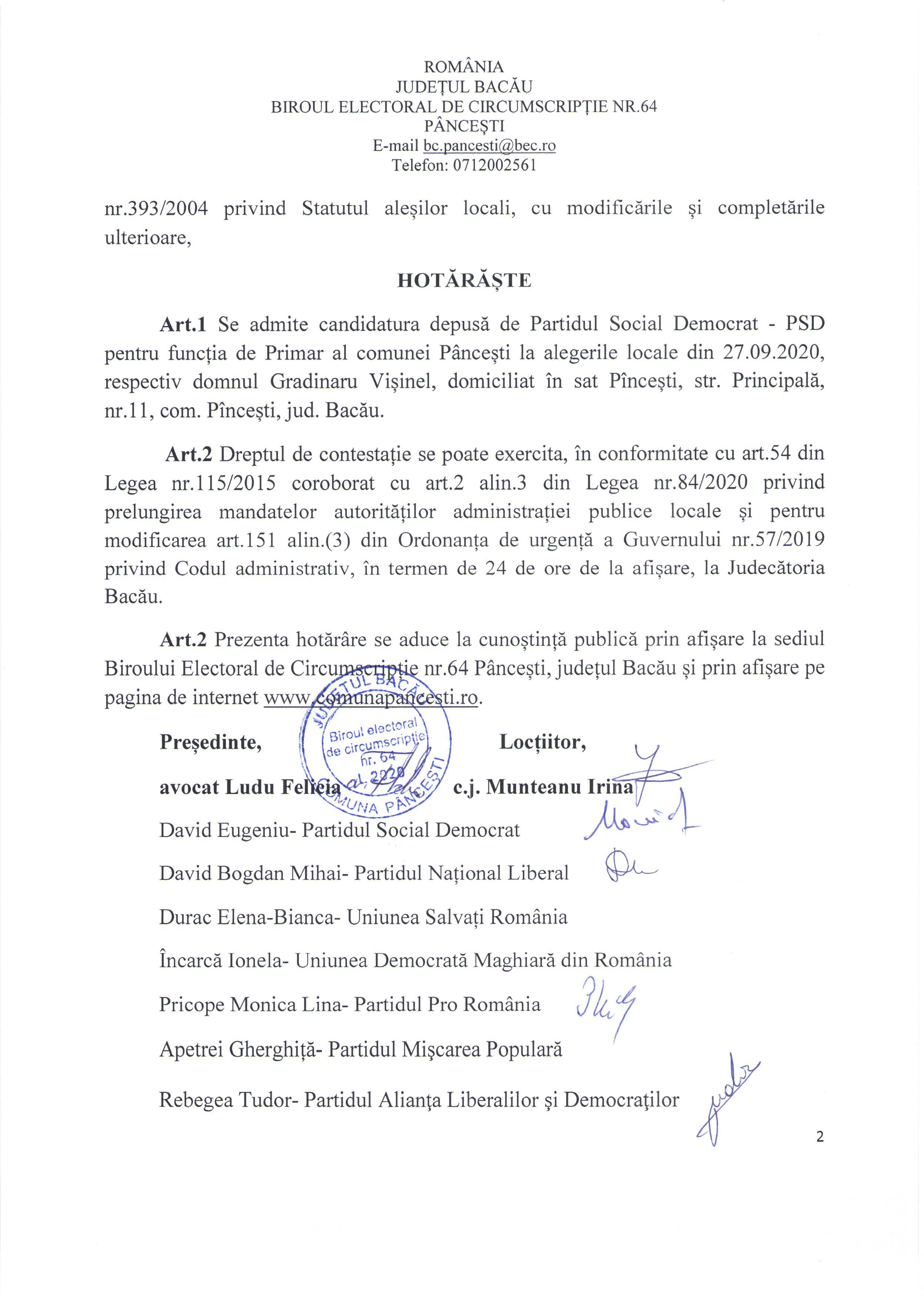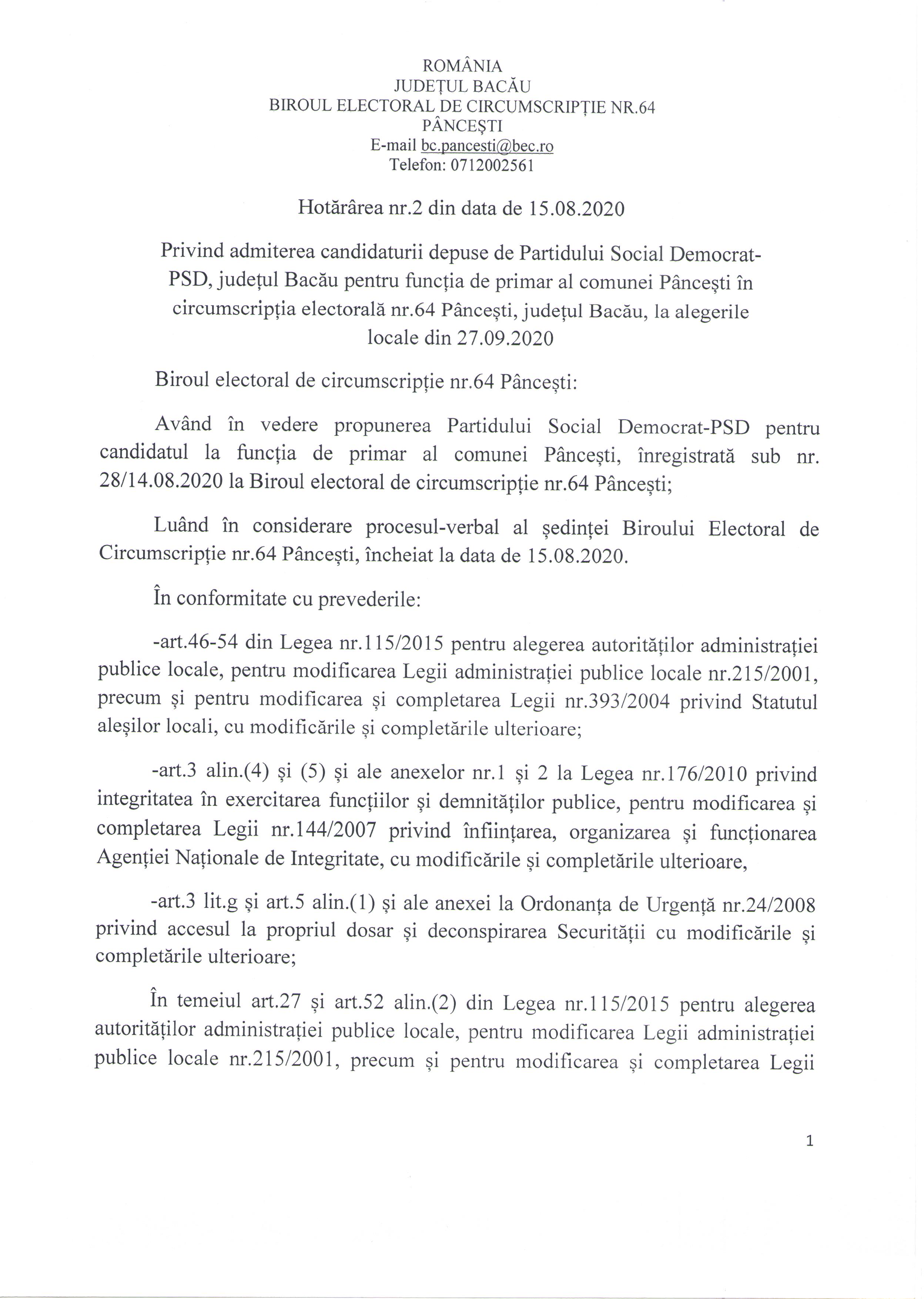 Privind admiterea candidaturii depuse de PSD, in functia de primar al com Pancesti