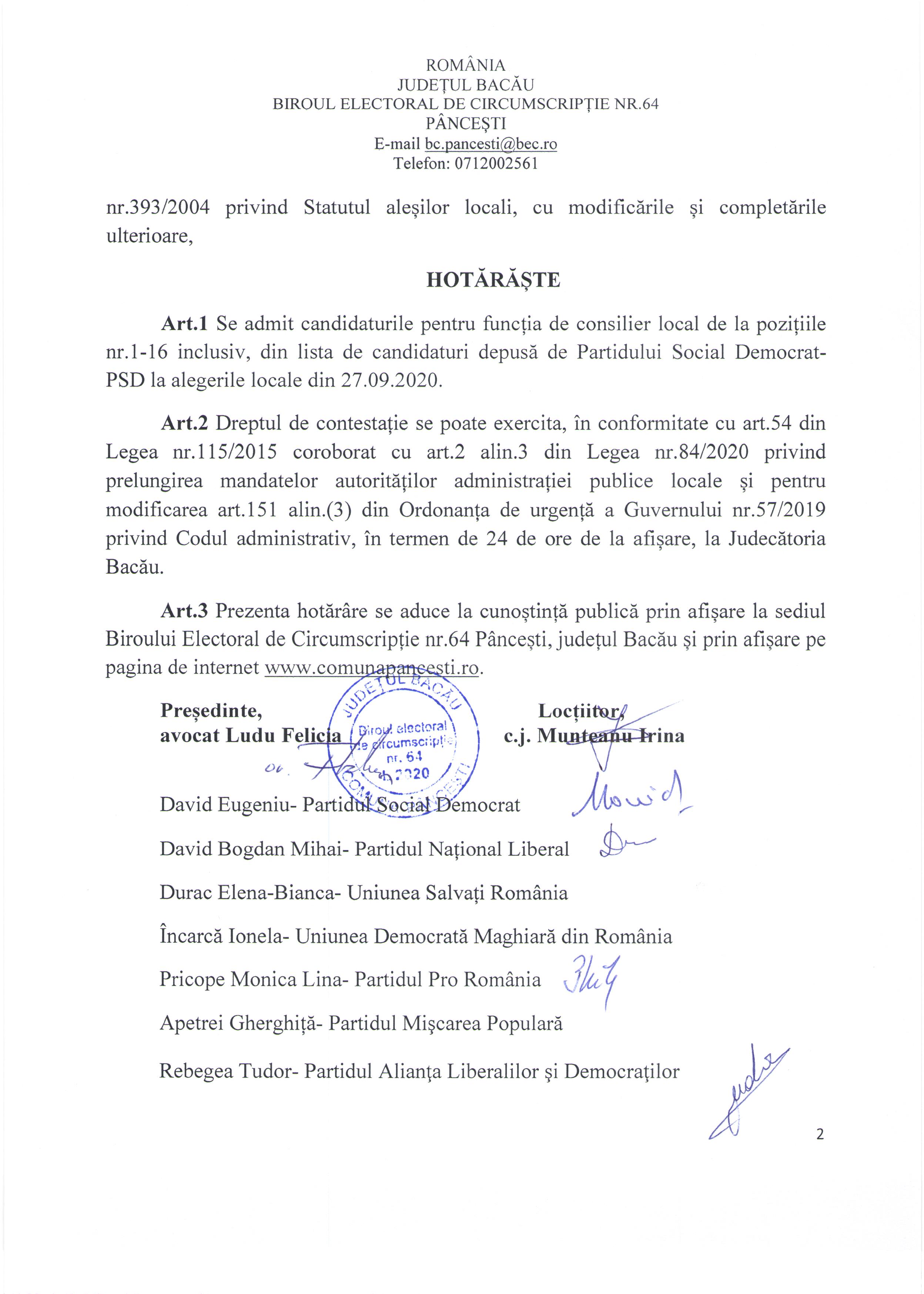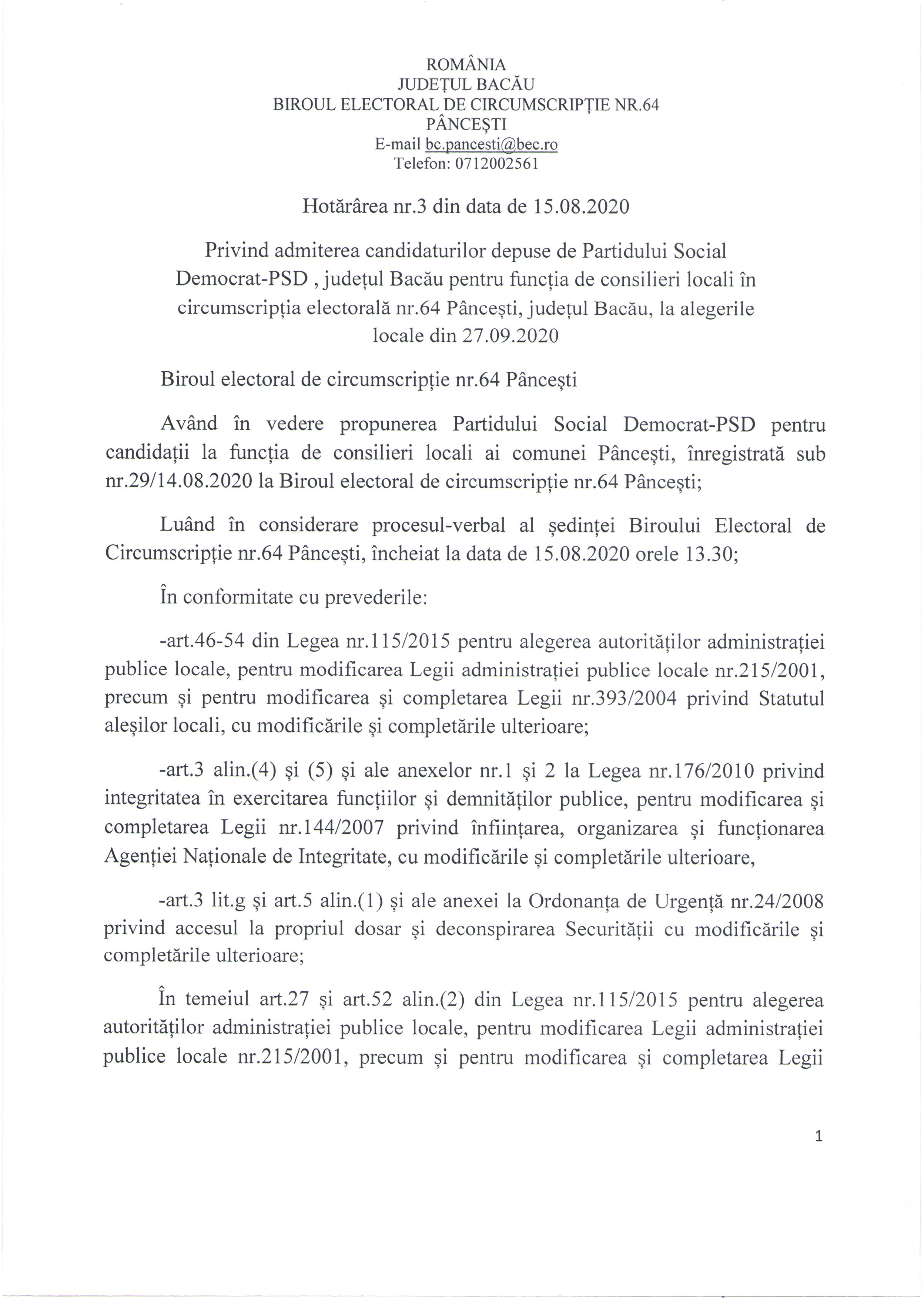 Privind admiterea candidaturii depuse de PSD, in functia de consilier local