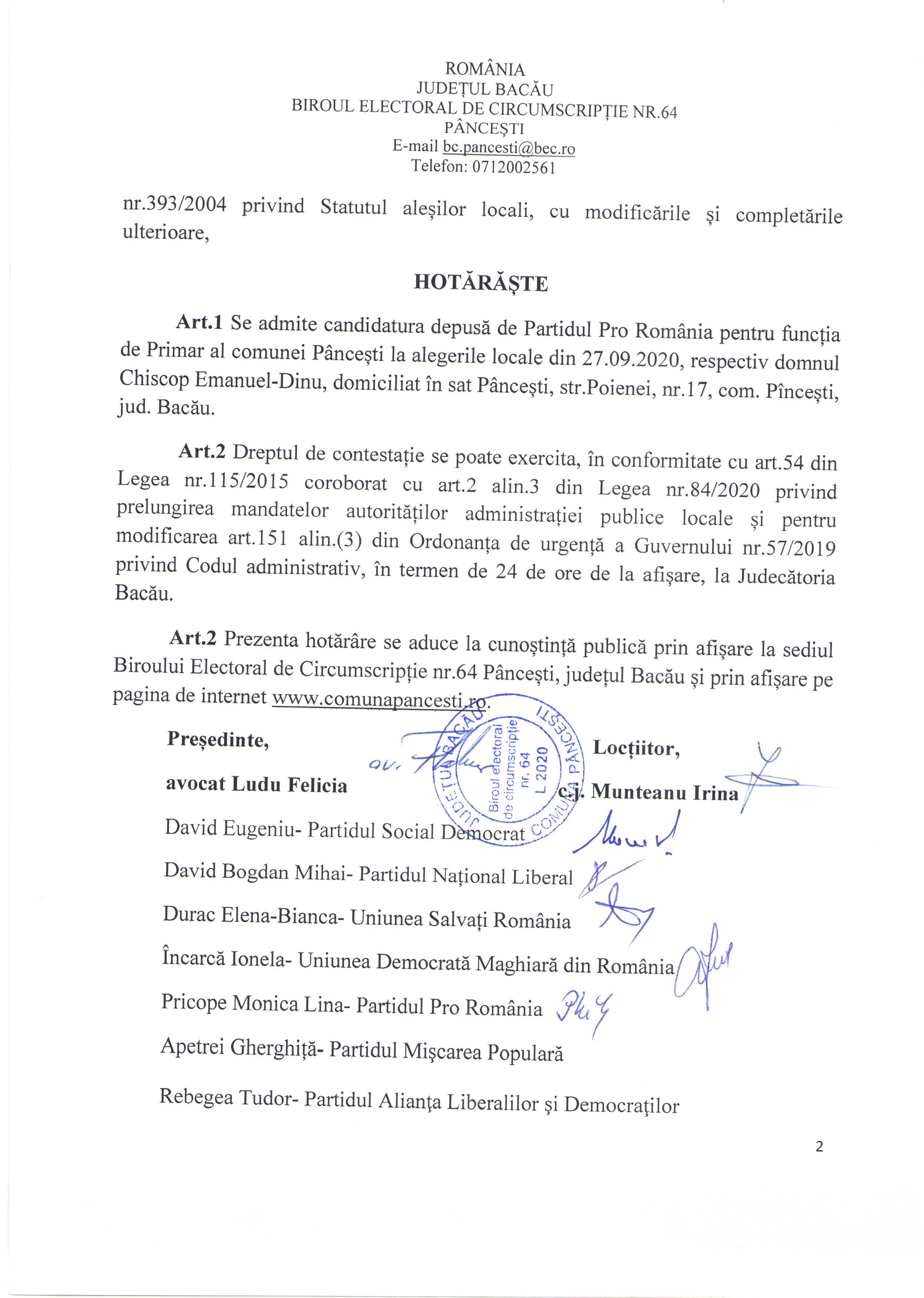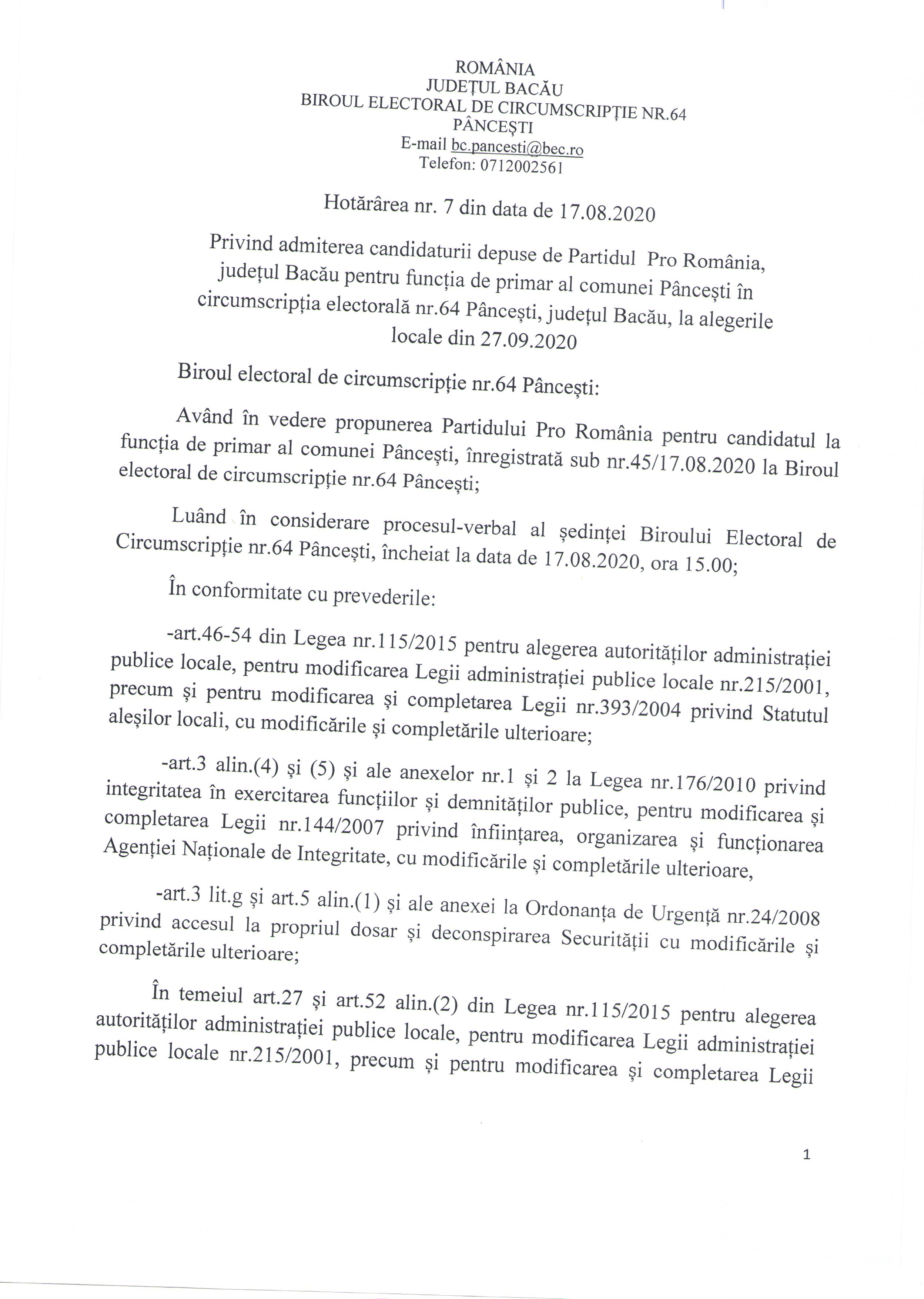 Privind admiterea candidaturii depuse de PRO ROMANIA, pentru functia de primar al comunei Pancesti